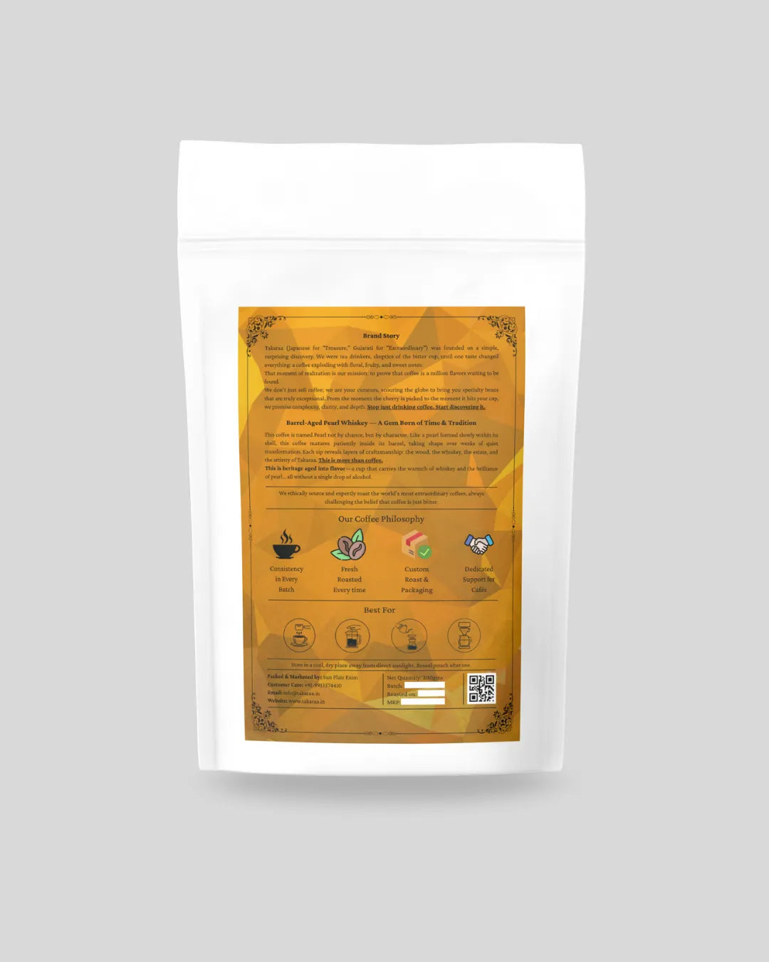 Pearl Whiskey Coffee is a premium barrel-aged specialty coffee from Ratnagiri Estate (1350 MASL) in India's Western Ghats. This exceptional coffee undergoes 45 days of aging in single-malt-seasoned oak barrels, creating sophisticated flavor complexity with zero alcohol content.
