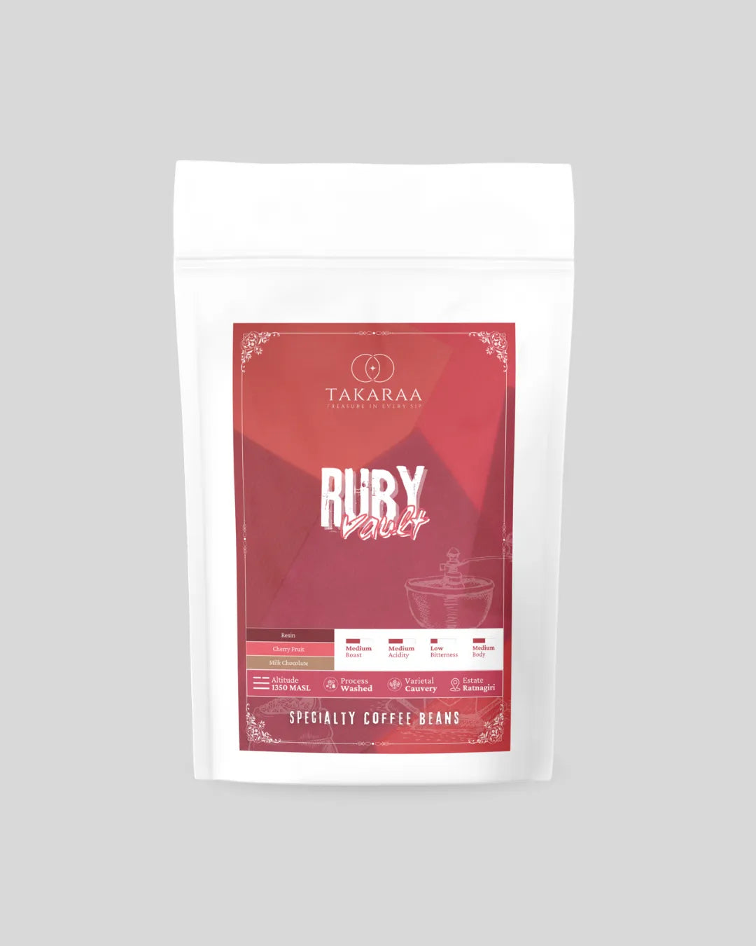 Ruby Vault is a premium washed process single-origin specialty coffee from Ratnagiri Estate (1350 MASL) in India's Western Ghats. This Cauvery varietal showcases exceptional clarity and bright, clean flavors that specialty coffee connoisseurs prize.